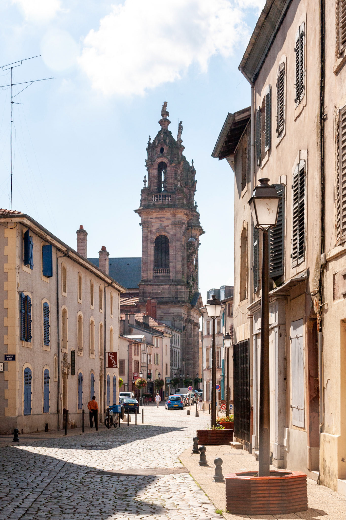 A full vertical view of a grand historic church in a French town, showcasing ornate Baroque architecture, symmetrical twin bell towers, a central clock, and a rose window under a clear blue sky.