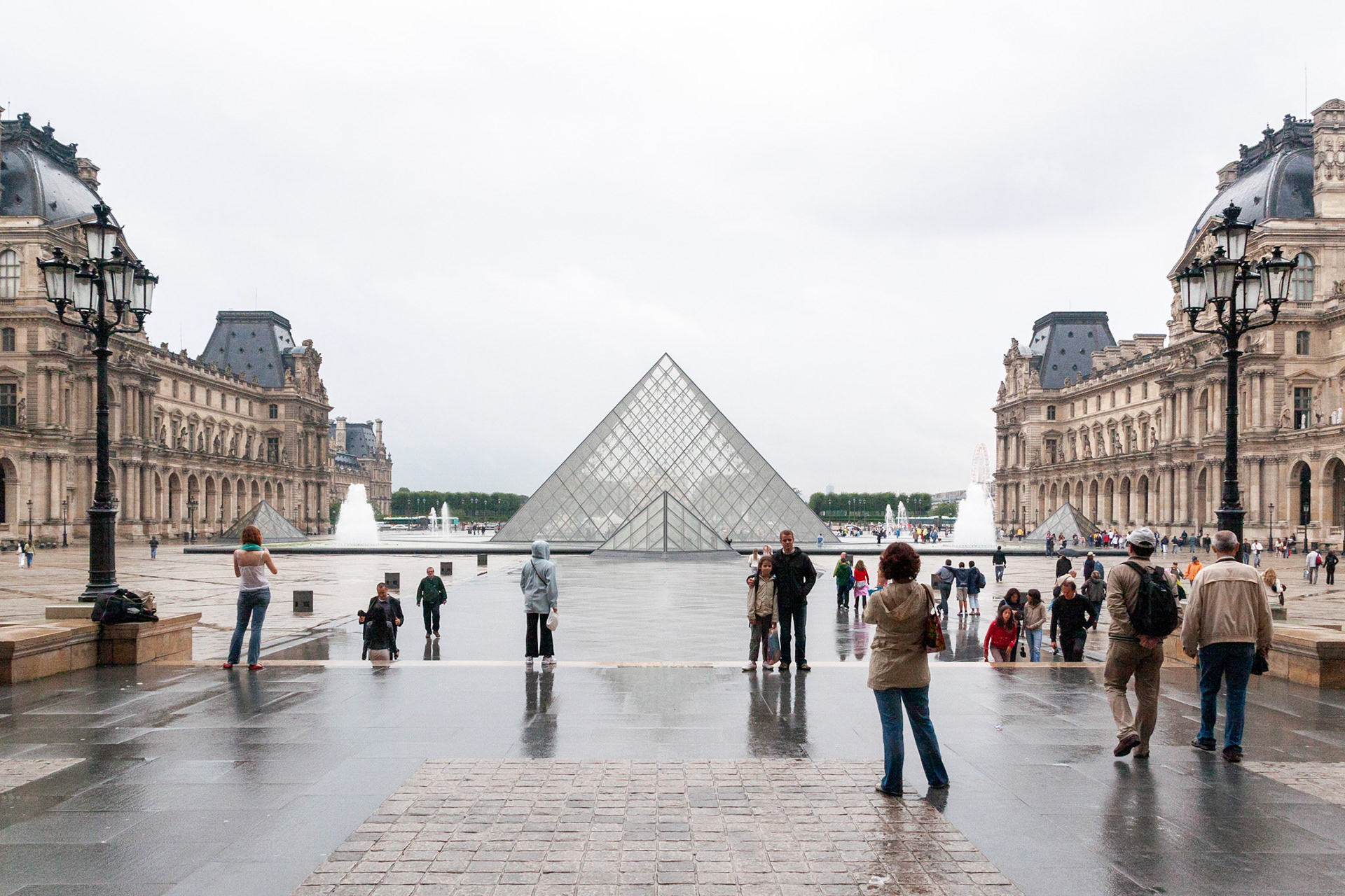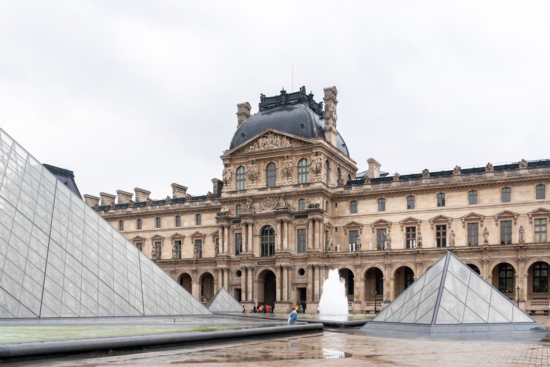 A striking juxtaposition of modern glass pyramid structures and a grand Renaissance-style palace facade in a Parisian courtyard. The scene includes water fountains and classical stone sculptures under an overcast sky.