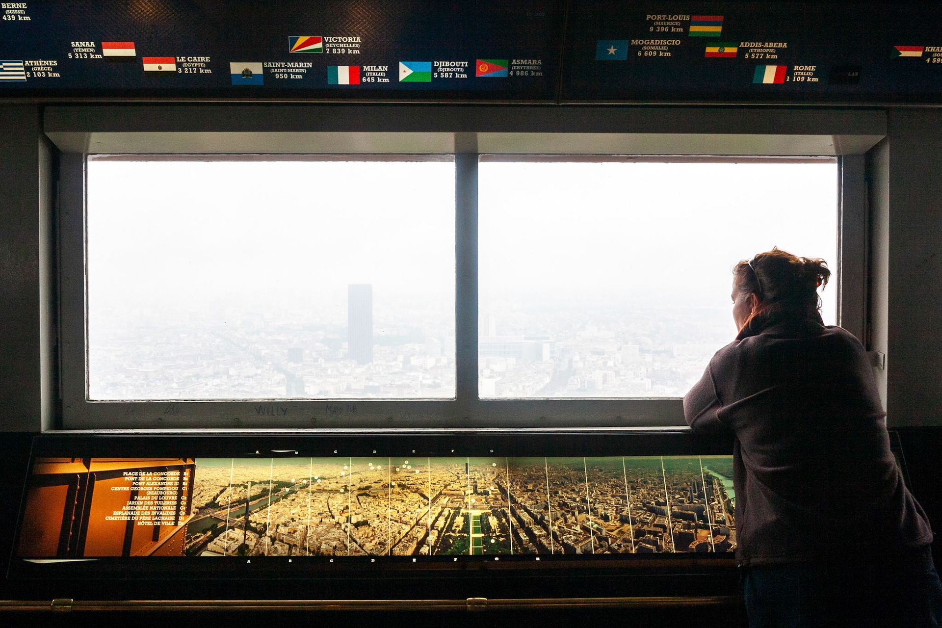 An expansive aerial view overlooking the diverse architectural landscape of Paris, France, featuring a mix of classic Haussmann buildings and modern apartment blocks under a misty, overcast sky.